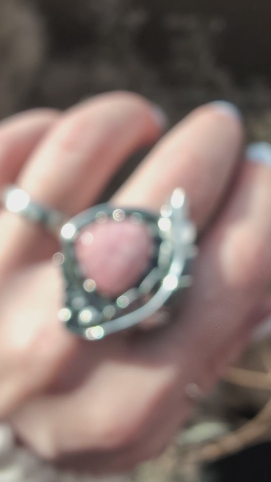 This rhodochrosite ring is made by hand in sterling silver. It has a unique design, featuring botanical elements and small silver accents.