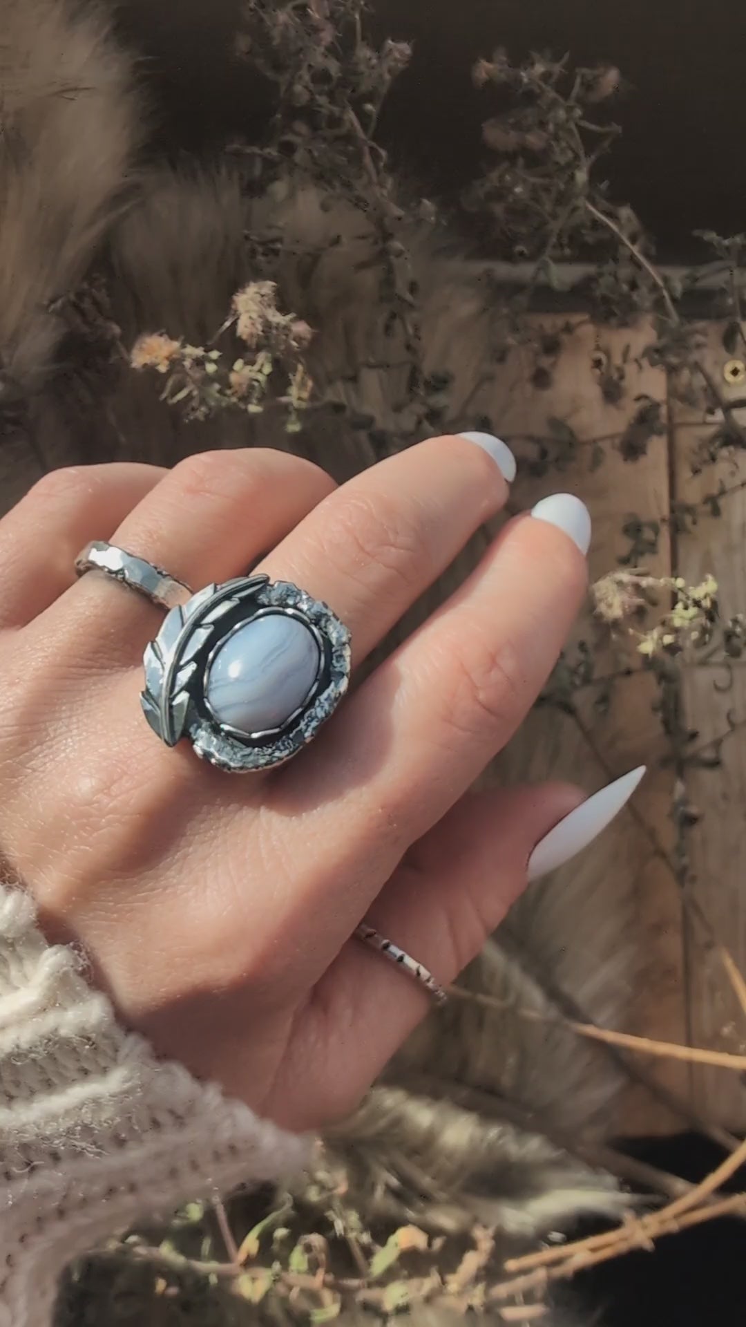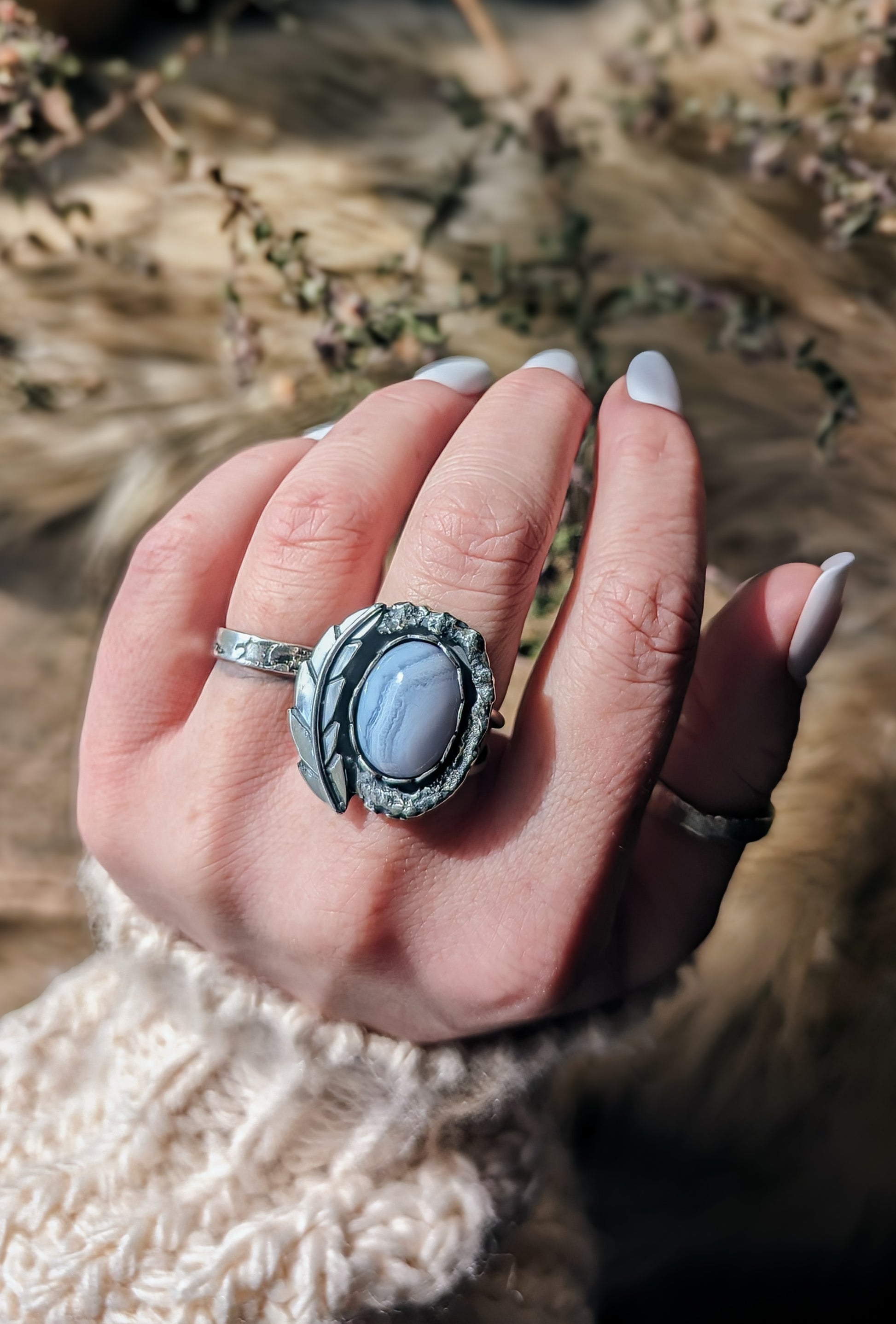 This Blue Lace Agate ring is made by hand in sterling silver. It has a unique design, featuring botanical elements and rough silver accents made from melted, recycled scrap silver. Embrace nature's beauty with this one-of-a-kind piece.